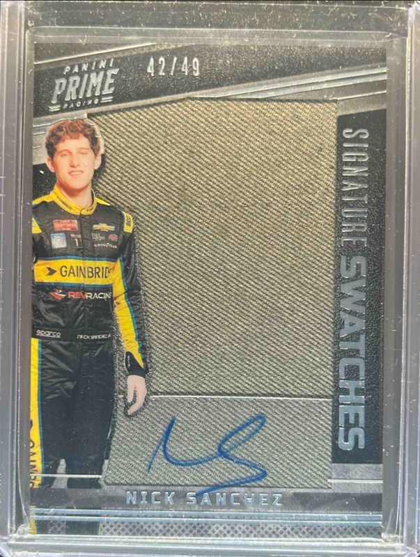The Nick Sanchez 2023 Panini Prime #SSW-NSC Signatures Swatches /49 card is 1 of 21 Nick Sanchez's card variations in the 2023 Panini Prime set being tracked by Sports Card Investor, including Race Used Firesuits /99, Race Used Sheet Metal /99, Race Used Tires /99, Race Used Firesuits - Holo Gold /25, and Race Used Sheet Metal - Holo Gold /25.