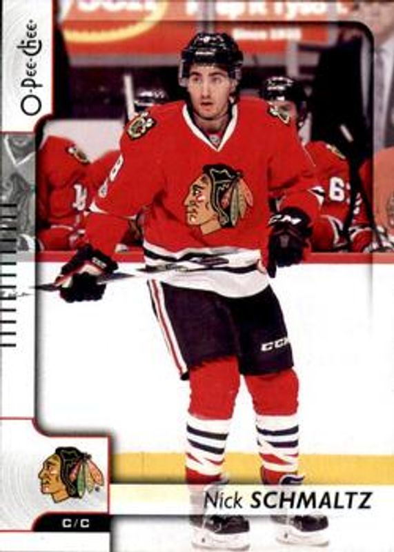 The Nick Schmaltz 2017 O-Pee-Chee #493 Base card is 1 of 6 Nick Schmaltz's card variations in the 2017 O-Pee-Chee set being tracked by Sports Card Investor, including Rainbow Foil, Red, Retro, Retro Blank Back, and Black Rainbow Foil /100.