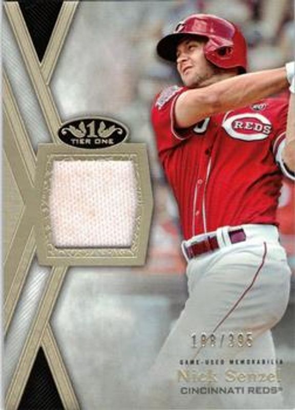 The Nick Senzel 2020 Topps Tier One #T1R-NS Relics /395 card is 1 of 14 Nick Senzel's card variations in the 2020 Topps Tier One set being tracked by Sports Card Investor, including Break Out Autographs /299, Autographed Relics /99, Autographed Relics Dual - Patch /25, Break Out Autographs - Bronze Ink /25, and Relics Dual - Patch /25.