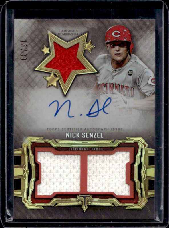 The Nick Senzel 2020 Topps Triple Threads #RFPAR-NS Rookies & Future Phenoms /99 card is 1 of 43 Nick Senzel's card variations in the 2020 Topps Triple Threads set being tracked by Sports Card Investor, including Autographs Single Jumbo Relics /99, Autographs Single Jumbo Relics - Amethyst /75, Rookies & Future Phenoms - Amethyst /75, Autographs Single Jumbo Relics - Emerald /50, and Rookies & Future Phenoms - Emerald /50.