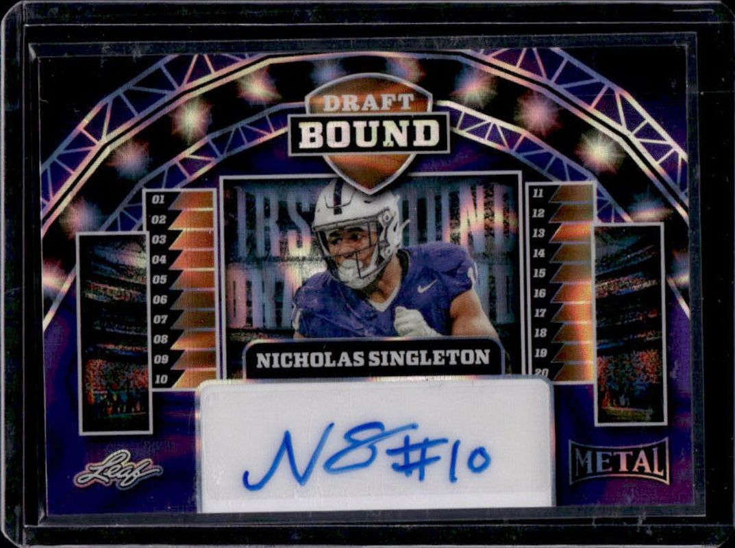 The Nick Singleton 2025 Leaf Metal #DB-NS1 Draft Bound - Lava Purple /7 card is 1 of 123 Nick Singleton's card variations in the 2025 Leaf Metal set being tracked by Sports Card Investor, including Prismatic Silver /149, Prismatic Blue /49, Prismatic Red /25, Prismatic Purple /10, and Prismatic Green /7.