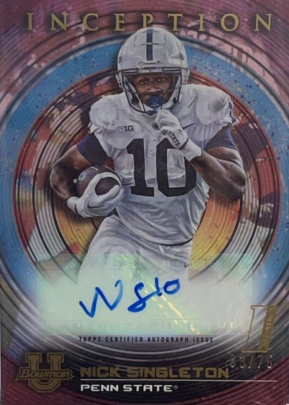 This card is 1 of 7 Nick Singleton's card variations in the 2022 Bowman University Inception set being tracked by Sports Card Investor, including Autographs (1st), Autographs - Blue Foil /99 (1st), Autographs - Gold Foil /50 (1st), Autographs - Orange Foil /25 (1st), and Autographs - Red Foil /5 (1st).