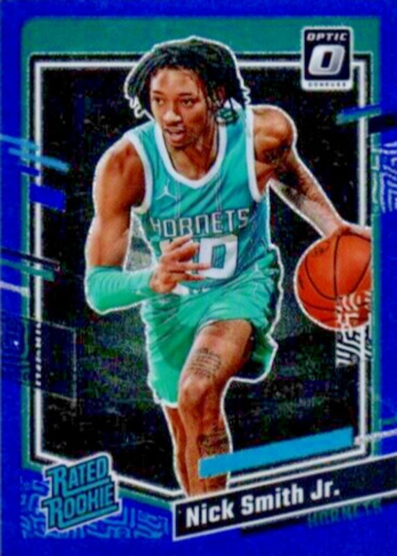 This card is 1 of 55 Nick Smith Jr.'s card variations in the 2023 Optic set being tracked by Sports Card Investor, including Base, Blue Velocity, Checkerboard, Choice Red & Green, and Fast Break.