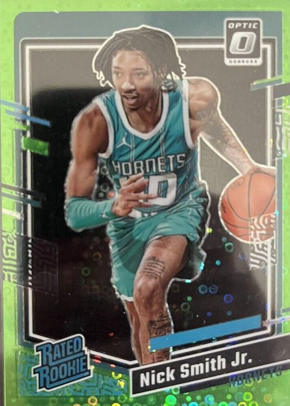 The Nick Smith Jr. 2023 Optic #224 Fast Break Neon Green /5 Rookie card in Raw condition has not changed in price in the last 30 days and was last sold for $130.00 .