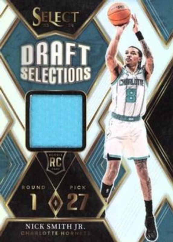 The Nick Smith Jr. 2023 Select #DSM-NS Draft Selections Memorabilia Rookie card is 1 of 222 Nick Smith Jr.'s card variations in the 2023 Select set being tracked by Sports Card Investor, including Concourse, Courtside, Mezzanine, Premier Level, and Concourse Blue Cracked Ice.