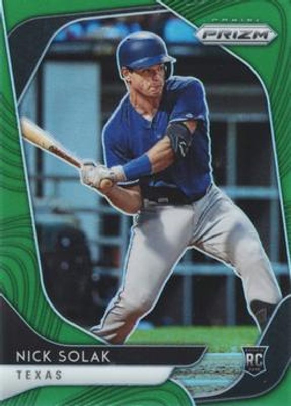 The Nick Solak 2020 Prizm #232 Green Rookie card is 1 of 60 Nick Solak's card variations in the 2020 Prizm set being tracked by Sports Card Investor, including Base, Blue, Carolina Blue, Cosmic Haze, and Pink.