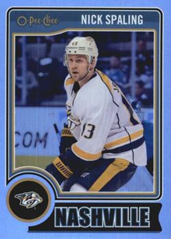 The Nick Spaling 2014 O-Pee-Chee #184 Rainbow card is 1 of 6 Nick Spaling's card variations in the 2014 O-Pee-Chee set being tracked by Sports Card Investor, including Base, Red, Retro, Retro Blank Backs, and Black Rainbow /100.
