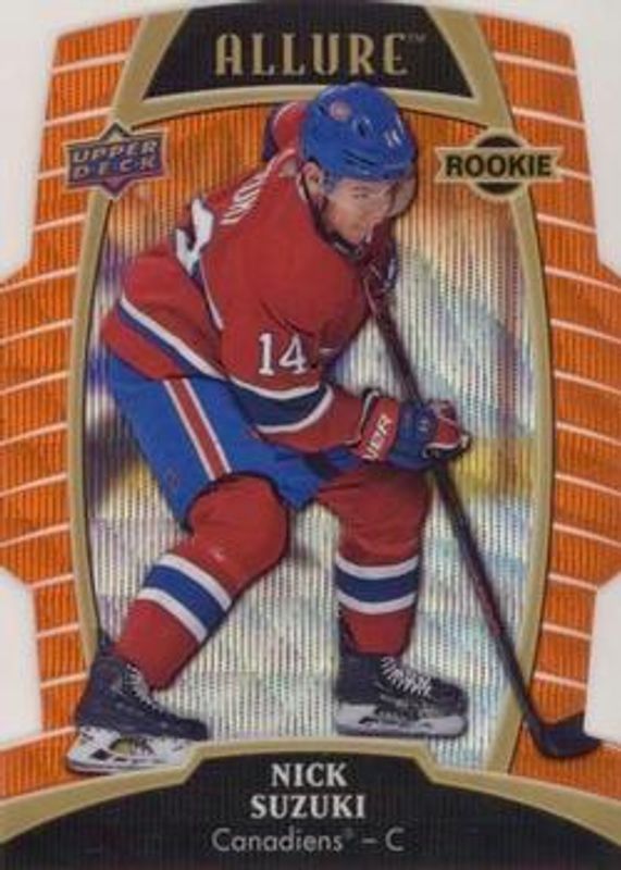 The Nick Suzuki 2019 Upper Deck Allure #91 Orange Slice /199 Rookie card is 1 of 41 Nick Suzuki's card variations in the 2019 Upper Deck Allure set being tracked by Sports Card Investor, including #108 Base, #91 Base, #91 Pewter, #108 Pink Diamond, and #91 Red Rainbow.