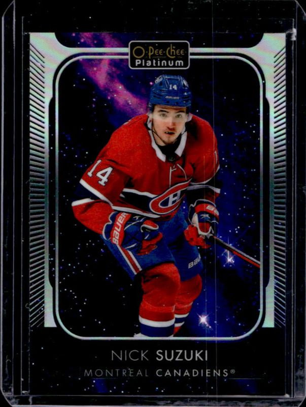 The Nick Suzuki 2021 O-Pee-Chee Platinum #82 Cosmic /65 card is 1 of 32 Nick Suzuki's card variations in the 2021 O-Pee-Chee Platinum set being tracked by Sports Card Investor, including Base, Blue Surge, Matte Pink, Neon Yellow Surge, and Rainbow.