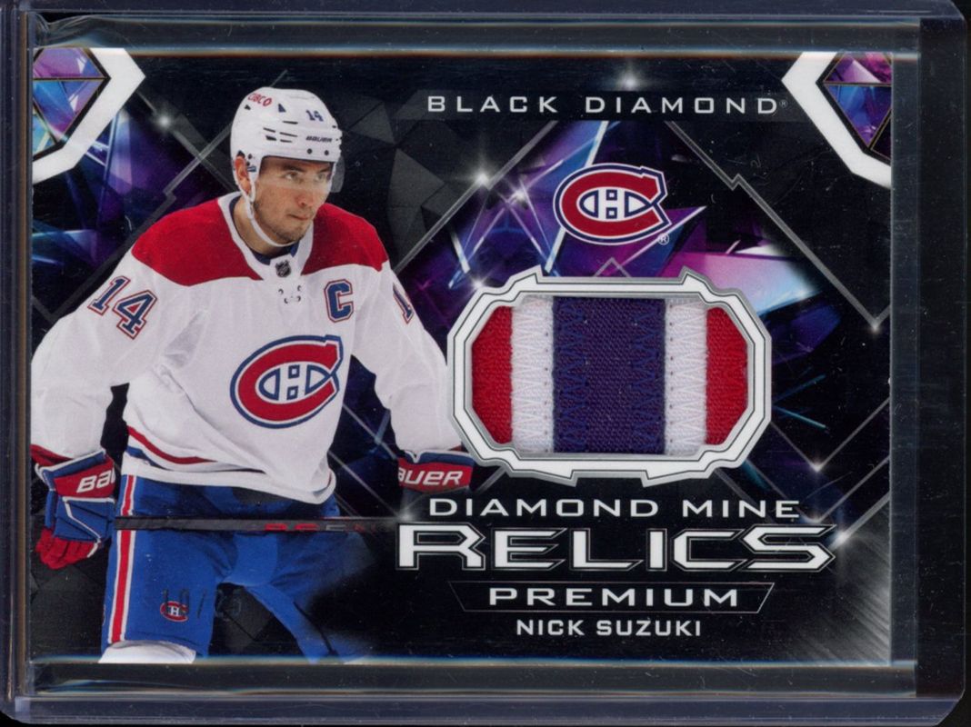 The Nick Suzuki 2023 Upper Deck Black Diamond #DMR-NS Diamond Mine Relics Premium /25 card is 1 of 17 Nick Suzuki's card variations in the 2023 Upper Deck Black Diamond set being tracked by Sports Card Investor, including Base /349, Red /75, Blue /25, Green /10, and Diamond Relics /5.
