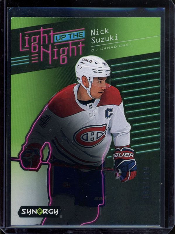 The Nick Suzuki 2023 Upper Deck Synergy #LN-NS Light Up the Night - Green /49 card is 1 of 23 Nick Suzuki's card variations in the 2023 Upper Deck Synergy set being tracked by Sports Card Investor, including Base /24, Red, Red Codes, Purple /99, and Gold /25.