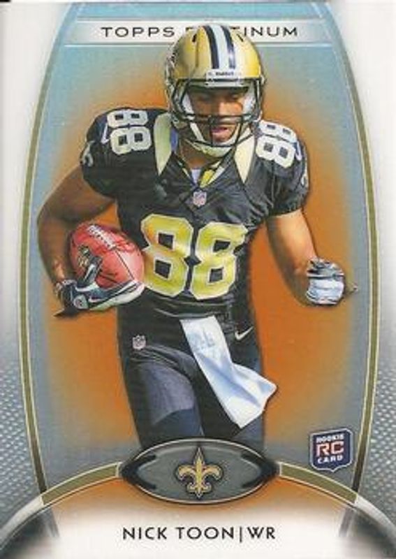 The Nick Toon 2012 Topps Platinum #123 Orange Refractor Rookie card is 1 of 37 Nick Toon's card variations in the 2012 Topps Platinum set being tracked by Sports Card Investor, including Base, Black Refractor, X-Fractor, Blue Refractor /99, and Purple Refractor /75.