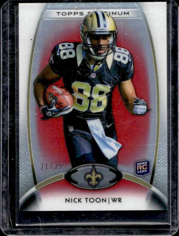 The Nick Toon 2012 Topps Platinum #123 Red Refractor /25 Rookie card is 1 of 37 Nick Toon's card variations in the 2012 Topps Platinum set being tracked by Sports Card Investor, including Base, Black Refractor, Orange Refractor, X-Fractor, and Blue Refractor /99.