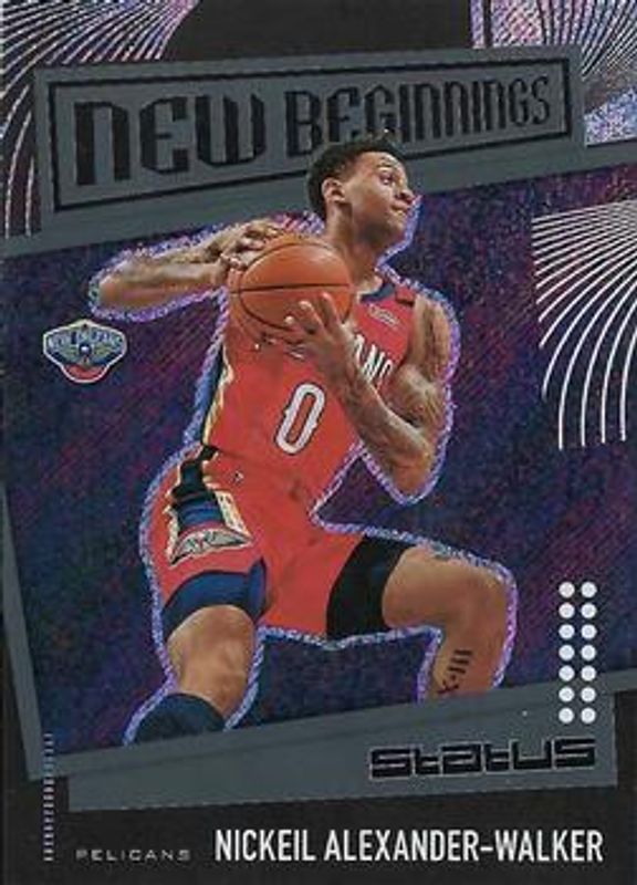 The Nickeil Alexander-Walker 2019 Status #4 New Beginnings Rookie card is 1 of 22 Nickeil Alexander-Walker's card variations in the 2019 Status set being tracked by Sports Card Investor, including Base, Blue, Red, White Diamonds /125, and Green Escher Squares /49.