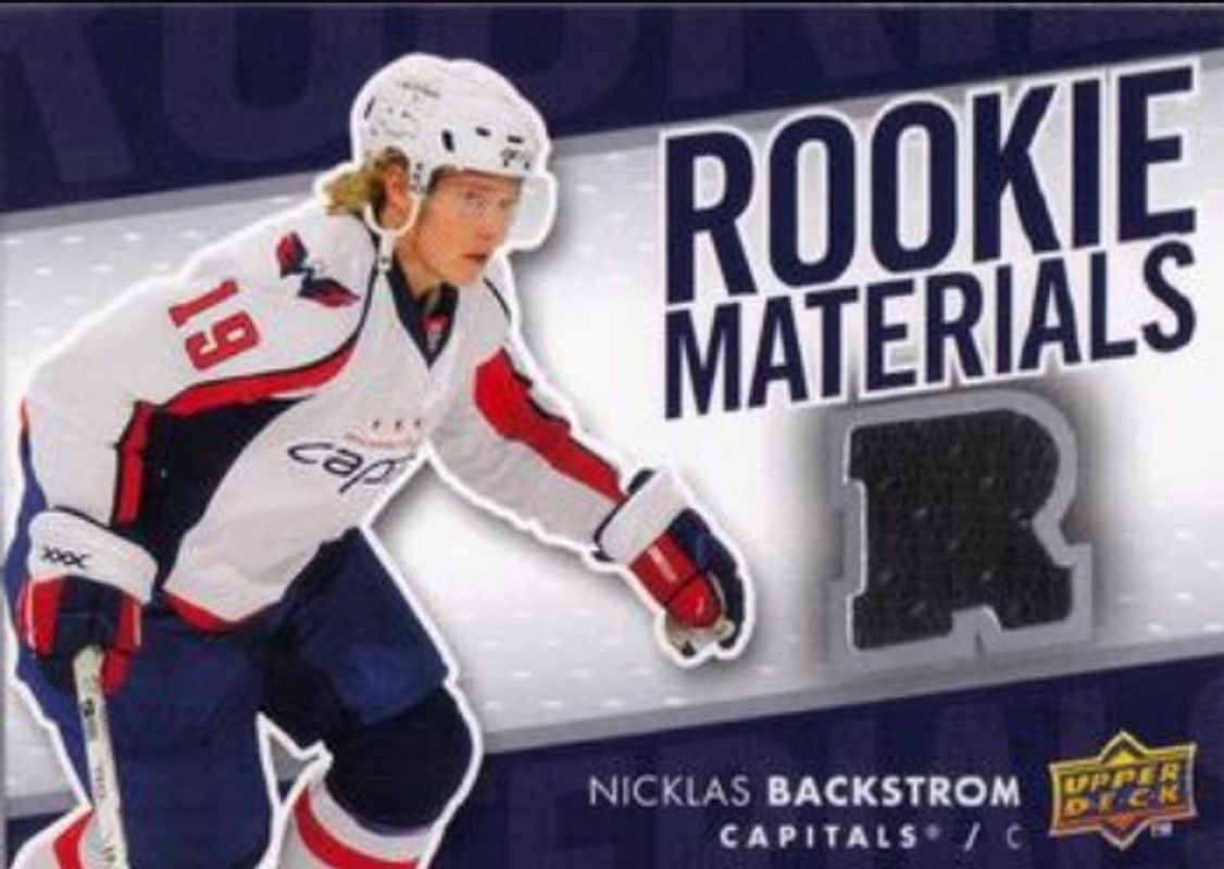 The Nicklas Backstrom 2007 Upper Deck #RM-BA Rookie Materials card is 1 of 12 Nicklas Backstrom's card variations in the 2007 Upper Deck set being tracked by Sports Card Investor, including Young Guns Base, Young Guns - UD Exclusives /100, Young Guns - UD High Gloss /10, Printing Plates Black /1, and Printing Plates Cyan /1.