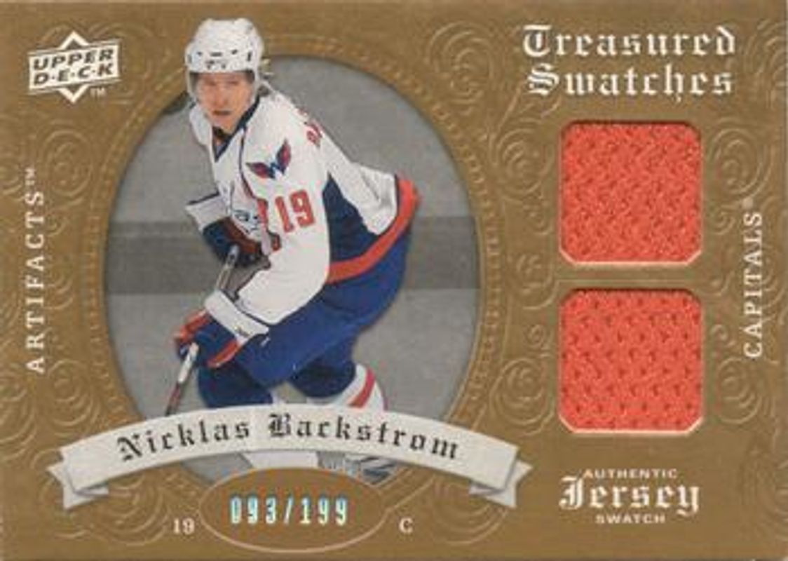 The Nicklas Backstrom 2008 Upper Deck Artifacts #TSD-NB Treasured Swatches Dual /199 card is 1 of 18 Nicklas Backstrom's card variations in the 2008 Upper Deck Artifacts set being tracked by Sports Card Investor, including Base /999, Gold /75, Blue /50, Copper Spectrum /25, and Gold Spectrum /5.