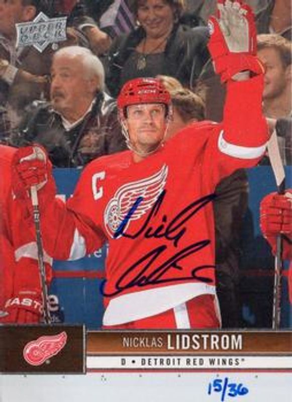 The Nicklas Lidstrom 2015 Upper Deck Buybacks #60 Buyback Autographs: 2012 Upper Deck /10 card is 1 of 30 Nicklas Lidstrom's card variations in the 2015 Upper Deck Buybacks set being tracked by Sports Card Investor, including Vintage Buyback Auto 2013 SP Authentic, Vintage Buyback Auto 2013 Ultimate, Buyback Autographs: 2012 SP Game Used /20, Auto Buyback 2011 The Cup /5, and Auto Buyback 2013 The Cup /5.