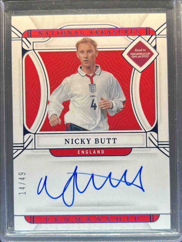 The Nicky Butt 2022 National Treasures World Cup #P-NBT Penmanship - Sapphire /25 card is 1 of 45 Nicky Butt's card variations in the 2022 National Treasures World Cup set being tracked by Sports Card Investor, including Definitive Ink /99, Legendary Signatures /99, Peerless Signatures /99, Penmanship /99, and Signatures /99.
