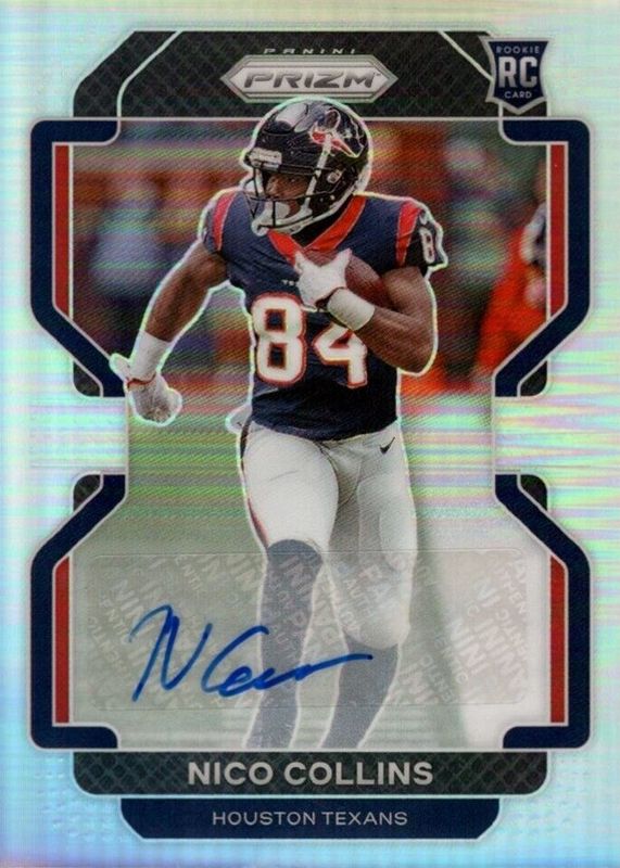 Nico Collins' Football cards are available in at least 23 sets. Nico Collins' biggest 7-day price movers are 2021 Mosaic #330 Reactive Blue, 2021 Prizm #360 Neon Green Pulsar, and 2021 Mosaic #330 Reactive Orange.