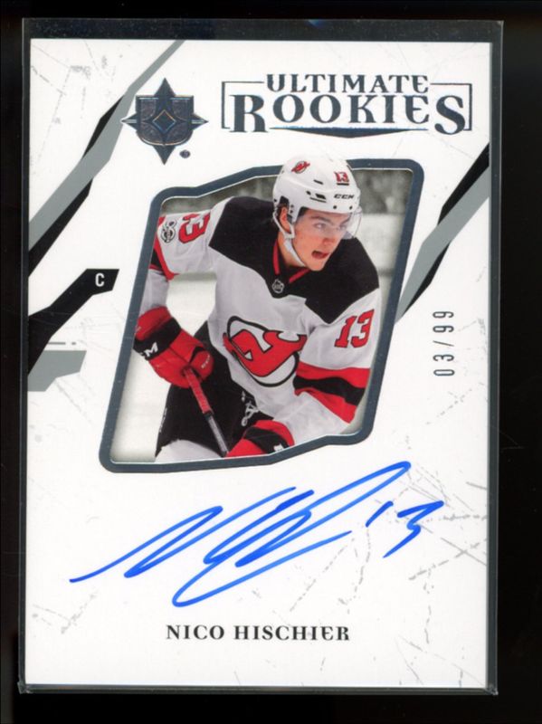 The Nico Hischier 2018 Upper Deck Ultimate Collection #99 2017 Upper Deck Ultimate Collection Update I /99 card is 1 of 10 Nico Hischier's card variations in the 2018 Upper Deck Ultimate Collection set being tracked by Sports Card Investor, including Base /149, Onyx Black /10, Signatures Masterpieces, Ultimate Materials Signatures /49, and 2017 Upper Deck Ultimate Collection Update I: Autographs Patch /10.