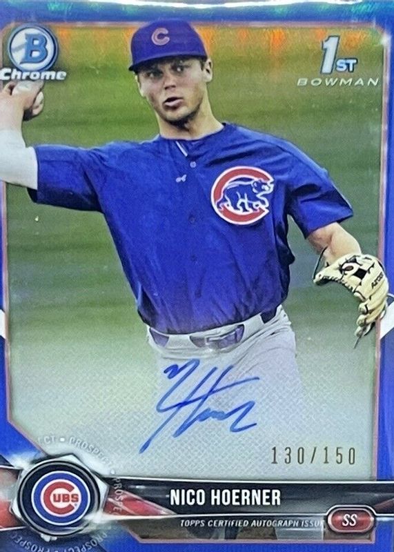 The Nico Hoerner 2018 Bowman Draft #CDA-NH Chrome DP Auto - Blue Refractor /150 (1st) card in Raw condition has not changed in price in the last 30 days and was last sold for $85.00 .