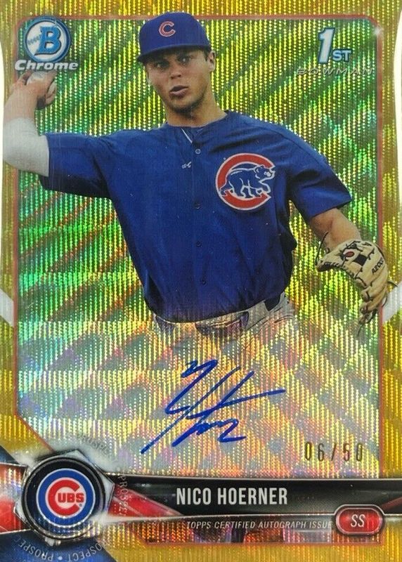 Best Prices Available For Sale of Nico Hoerner 2018 Bowman Draft #CDA-NH Chrome DP Auto - Gold Wave Refractor /50 (1st)