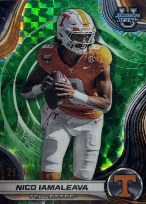 The Nico Iamaleava 2024 Bowman Best University #90 Lime Green Geometric Refractor /35 card in Raw condition has not changed in price in the last 30 days and was last sold for $18.50 .