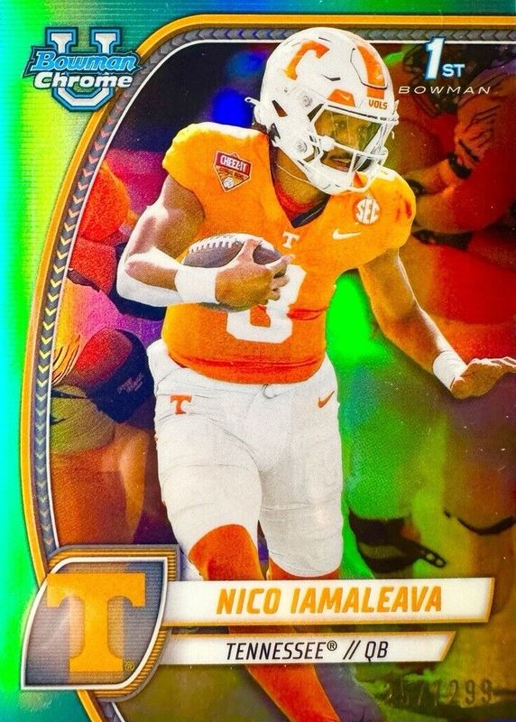 This card is 1 of 46 Nico Iamaleava's card variations in the 2024 Bowman Chrome University set being tracked by Sports Card Investor, including Base (1st), Image Variation (1st), Pink Lava Refractor (1st), Purple Shimmer Refractor (1st), and Refractor (1st).