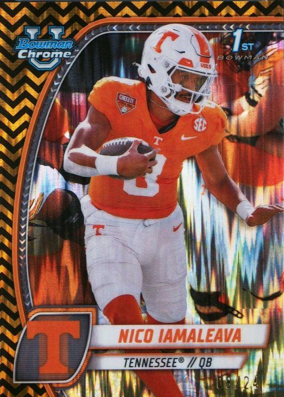 This card is 1 of 46 Nico Iamaleava's card variations in the 2024 Bowman Chrome University set being tracked by Sports Card Investor, including Base (1st), Image Variation (1st), Pink Lava Refractor (1st), Purple Shimmer Refractor (1st), and Refractor (1st).