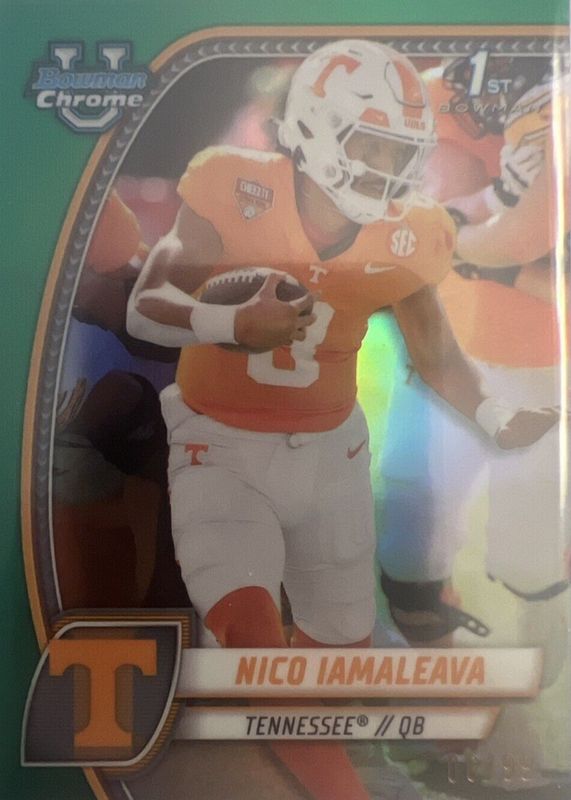 Best Prices Available For Sale of Nico Iamaleava 2024 Bowman Chrome University #139 Green Refractor /99 (1st)