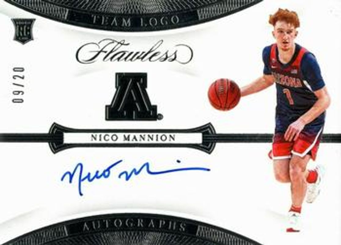 The Nico Mannion 2020 Flawless Collegiate #TLA-NM Team Logo Autographs /20 Rookie card is 1 of 38 Nico Mannion's card variations in the 2020 Flawless Collegiate set being tracked by Sports Card Investor, including #20 Base /20, #78 Base /20, #128 Base /20, #98 Base /20, and #78 Gold /10.