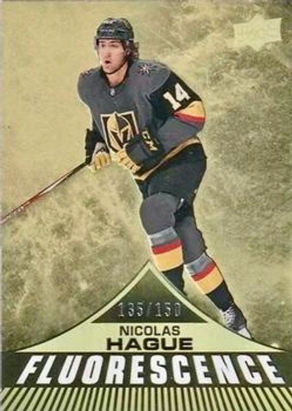 The Nicolas Hague 2019 Upper Deck #F-21 Fluorescence /150 Rookie card is 1 of 34 Nicolas Hague's card variations in the 2019 Upper Deck set being tracked by Sports Card Investor, including Young Guns Base, Young Guns Canvas, Young Guns - Clear Cut, Young Guns - Clear Cut Exclusives, and Young Guns - Silver Foil.