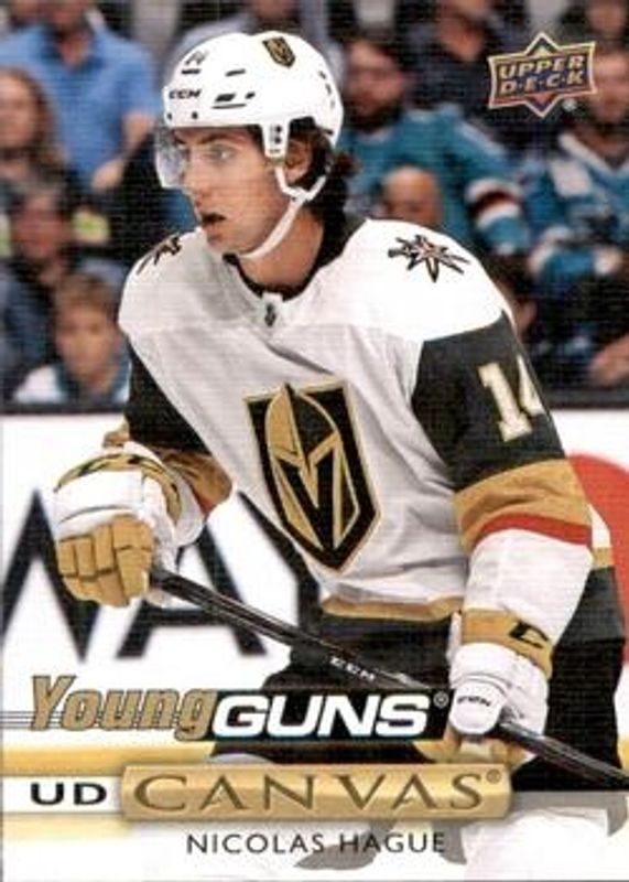 The Nicolas Hague 2019 Upper Deck #C105 Young Guns Canvas Rookie card is 1 of 34 Nicolas Hague's card variations in the 2019 Upper Deck set being tracked by Sports Card Investor, including Young Guns Base, Young Guns - Clear Cut, Young Guns - Clear Cut Exclusives, Young Guns - Silver Foil, and Young Guns - Speckled Rainbow Foil.