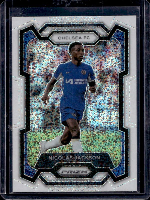 The Nicolas Jackson 2023 Prizm Premier League #195 White Sparkle /(SSP) card is 1 of 62 Nicolas Jackson's card variations in the 2023 Prizm Premier League set being tracked by Sports Card Investor, including Base, Blue Mosaic, Breakaway, Breakaway Orange, and Choice.