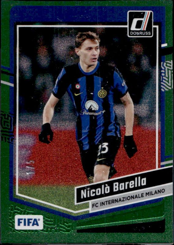 The Nicolo Barella 2023 Donruss #135 Green /5 card is 1 of 69 Nicolo Barella's card variations in the 2023 Donruss set being tracked by Sports Card Investor, including #135 Base, #36 Base, #135 Optic, #36 Optic, and #36 Cubic.