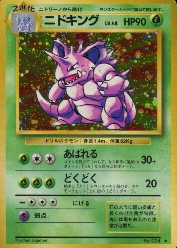 The Nidoking 1996 Japanese Base Set #34 Holo card in Raw TCG (Lightly Played) condition has not changed in price in the last 30 days and was last sold for $20.00 .