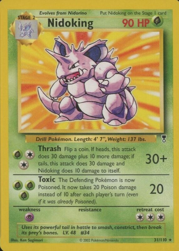 The Nidoking 2002 Legendary Collection #31 Base card in Raw TCG (Near Mint) condition has moved down -$3.06 (-25.4%) in the last 30 days and was last sold for $8.99 .