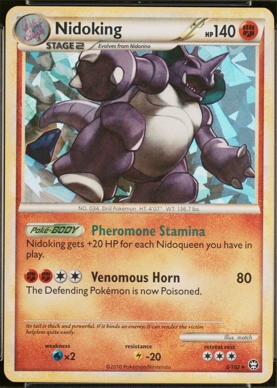 The Nidoking 2010 HeartGold & SoulSilver: Triumphant #006/102 Promo (Cracked Ice) card in Raw TCG (Lightly Played) condition has not changed in price in the last 30 days and was last sold for $2.50 .