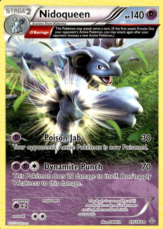The Nidoqueen 2015 XY: Primal Clash #069/160 Base card in Raw TCG (Lightly Played) condition has not changed in price in the last 30 days and was last sold for $3.00 .