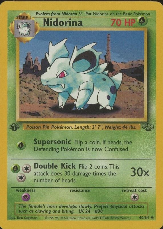 The Nidorina 1999 Jungle #40/64 1st Edition card in Raw TCG (Near Mint) condition has moved up $1.44 (+96.6%) in the last 30 days and was last sold for $2.93 .