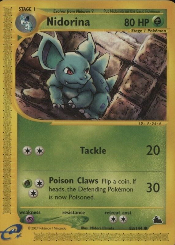 The Nidorina 2003 Skyridge #083/144 Base card in Raw TCG (Near Mint) condition has moved down -$0.04 (-0.6%) in the last 30 days and was last sold for $8.00 .