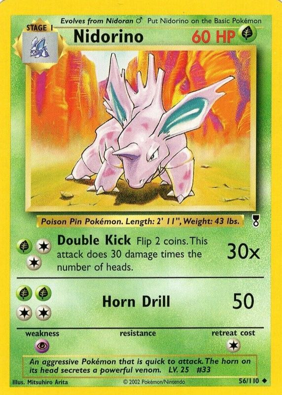 The Nidorino 2002 Legendary Collection #56 Base card in Raw TCG (Near Mint) condition has not changed in price in the last 30 days and was last sold for $2.89 .