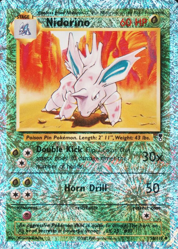 The Nidorino 2002 Legendary Collection #56 Reverse Holo card in Raw TCG (Near Mint) condition has moved down -$22.24 (-19.8%) in the last 30 days and was last sold for $90.00 .