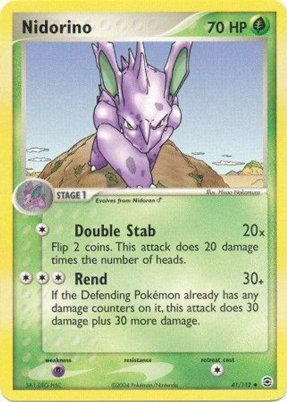The Nidorino 2004 EX: FireRed & LeafGreen #041/112 Base card in Raw TCG (Near Mint) condition has moved up $1.69 (+141%) in the last 30 days and was last sold for $2.89 .