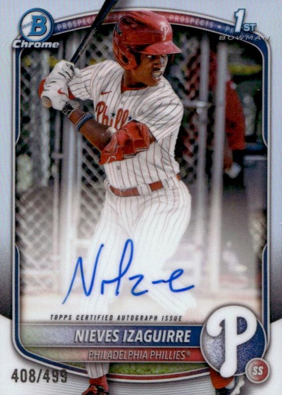 The Nieves Izaguirre 2025 Bowman Chrome #CPA-NI Prospect Auto - Refractor /499 (1st) card in Raw condition has moved up $0.63 (+12.7%) in the last 30 days and was last sold for $5.63 .