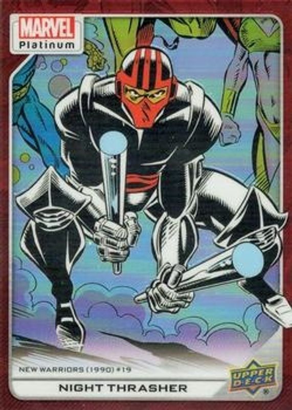 The Night Thrasher 2023 Upper Deck Marvel Platinum #196 Red Rainbow card is 1 of 30 Night Thrasher's card variations in the 2023 Upper Deck Marvel Platinum set being tracked by Sports Card Investor, including Base, Black Rainbow, Blue Rainbow, Blue Surge, and Purple Rainbow.