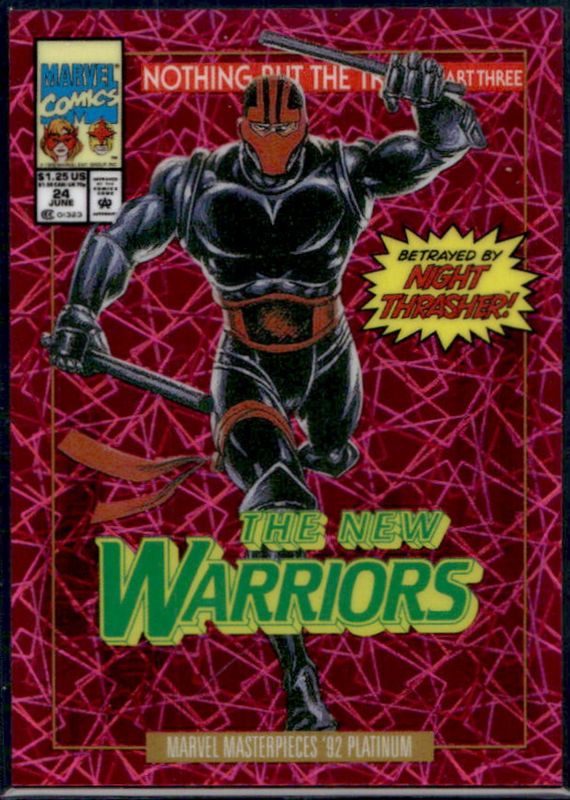 The Night Thrasher 2024 Upper Deck Marvel Masterpieces '92 Platinum #63-V Variant Cover - Pink Laser /692 card is 1 of 38 Night Thrasher's card variations in the 2024 Upper Deck Marvel Masterpieces '92 Platinum set being tracked by Sports Card Investor, including Base, Blue Traxx, Canvas, Clear Cut, and Emerald Surge.