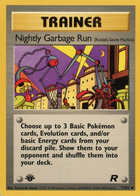 The Nightly Garbage Run 2000 Team Rocket #77/82 1st Edition card in Raw TCG (Near Mint) condition has moved up $1.24 (+45.1%) in the last 30 days and was last sold for $3.99 .