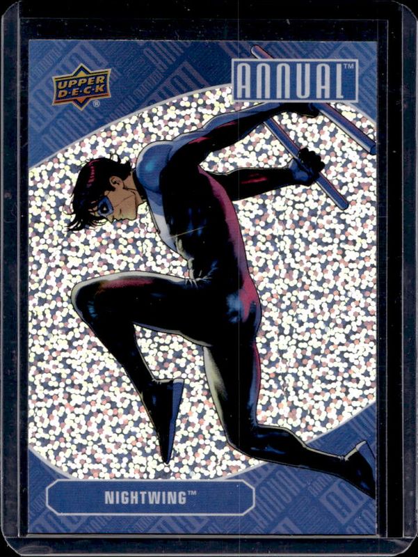 The Nightwing 2023 Upper Deck DC Annual #2 Silver Sparkle card is 1 of 32 Nightwing's card variations in the 2023 Upper Deck DC Annual set being tracked by Sports Card Investor, including Base, Blue, Variant Cover, Green /499, and Gold Linearity /88.