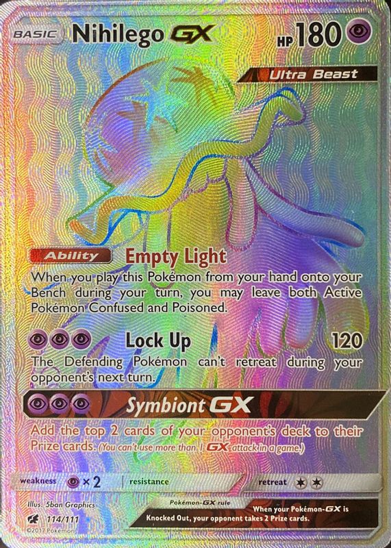 The Nihilego GX 2017 Sun & Moon: Crimson Invasion #114/111 Holo (Secret) card in Raw TCG (Near Mint) condition has moved up $13.50 (+208%) in the last 30 days and was last sold for $20.00 .